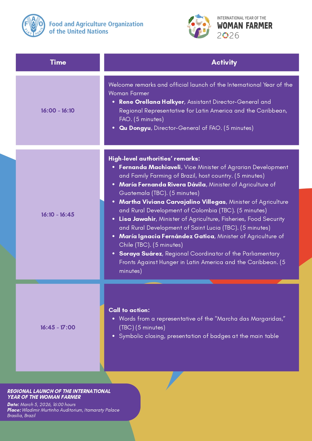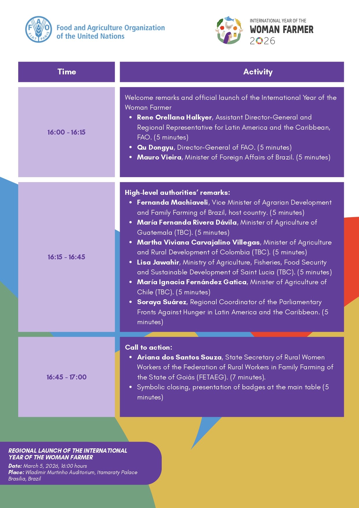 To carry out the regional launch of the International Year of the Woman Farmer, within the framework of the 39th FAO Regional Conference for Latin America and the Caribbean (LARC39), highlighting the strategic role of rural women in the agrifood systems of Latin America and the Caribbean.