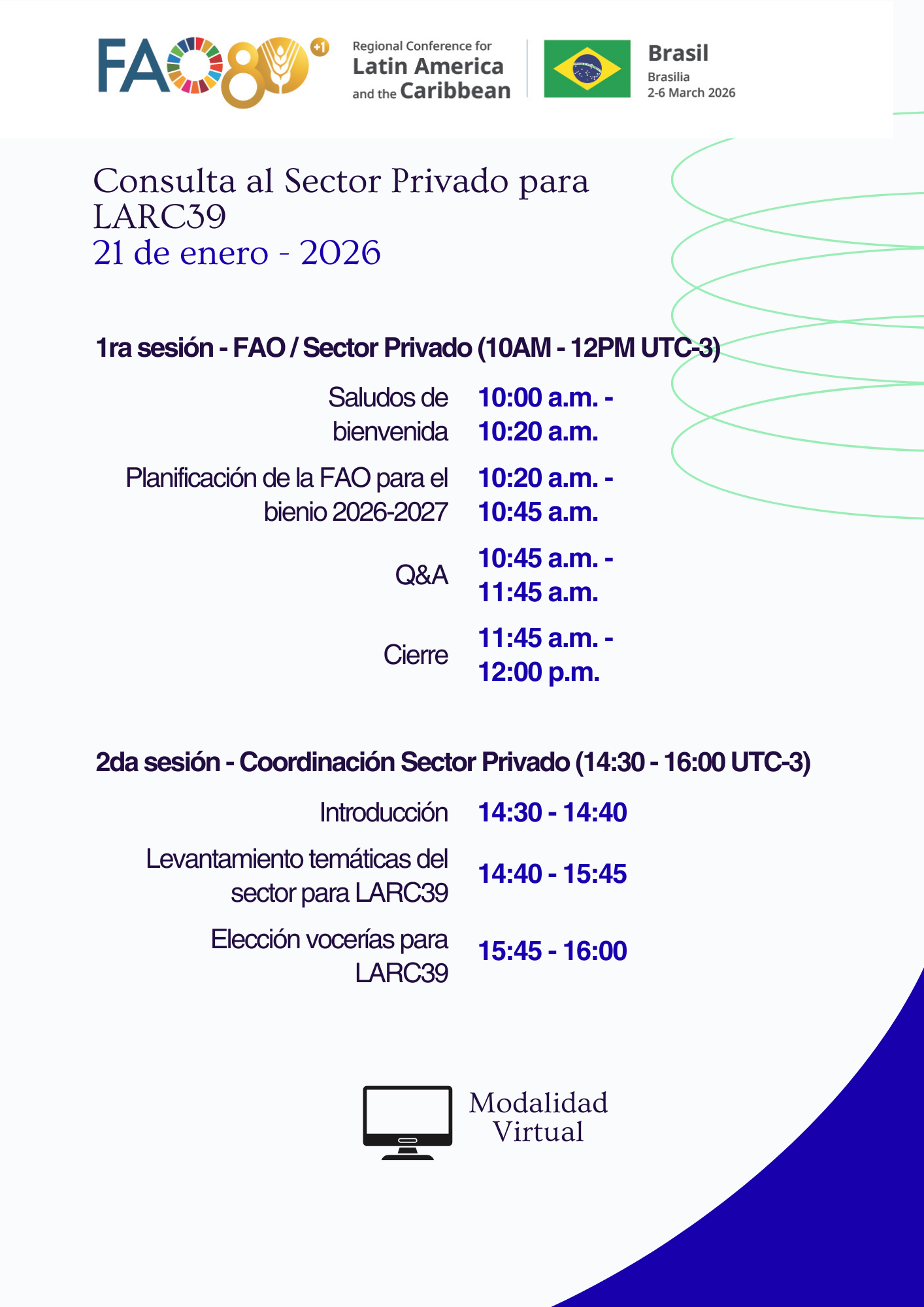 Esta sesión será mayoritariamente expositiva, es abierta y cuenta con un espacio amplio para hacer preguntas a los oficiales de la FAO. - Espacio de coordinación del sector privado (21/01 de 2:30 a 4 PM, hora de Santiago de Chile), donde representantes del sector definen aportes específicos y se organizan para la elaboración de la declaración del sector y determinar sus voceros para LARC39.