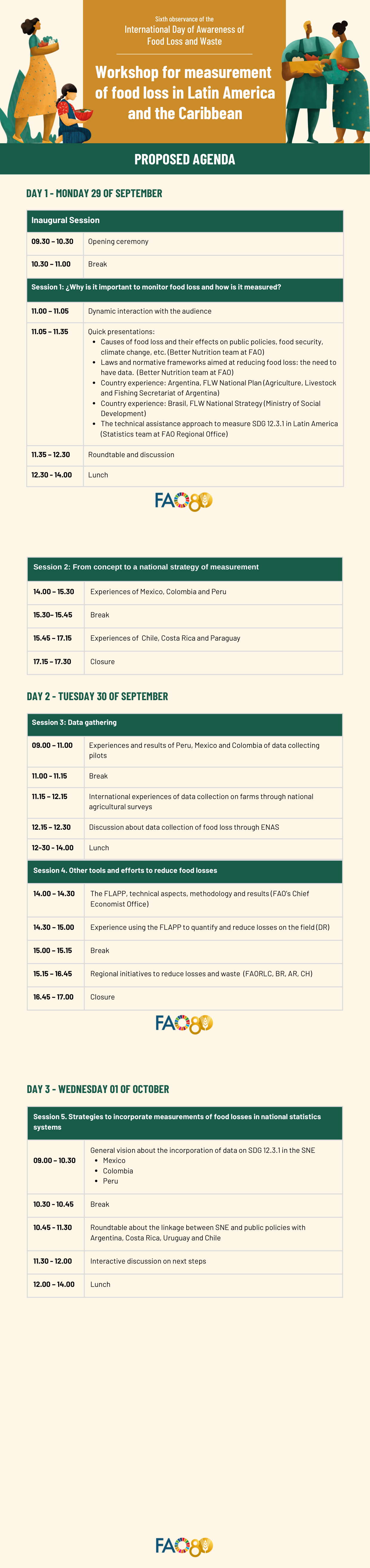 In the context of the Commemoration of the International Day of Awareness on Food Loss and Waste, the Food and Agriculture Organization of the United Nations (FAO) is inviting to the Workshop to the Workshop on Measuring Food Losses in Latin America and the Caribbean to learn the methodology for constructing the Food Loss Index (FLI), based on which countries could begin to report on their progress in their commitment to reduce post-harvest losses along their food chains by 2030.