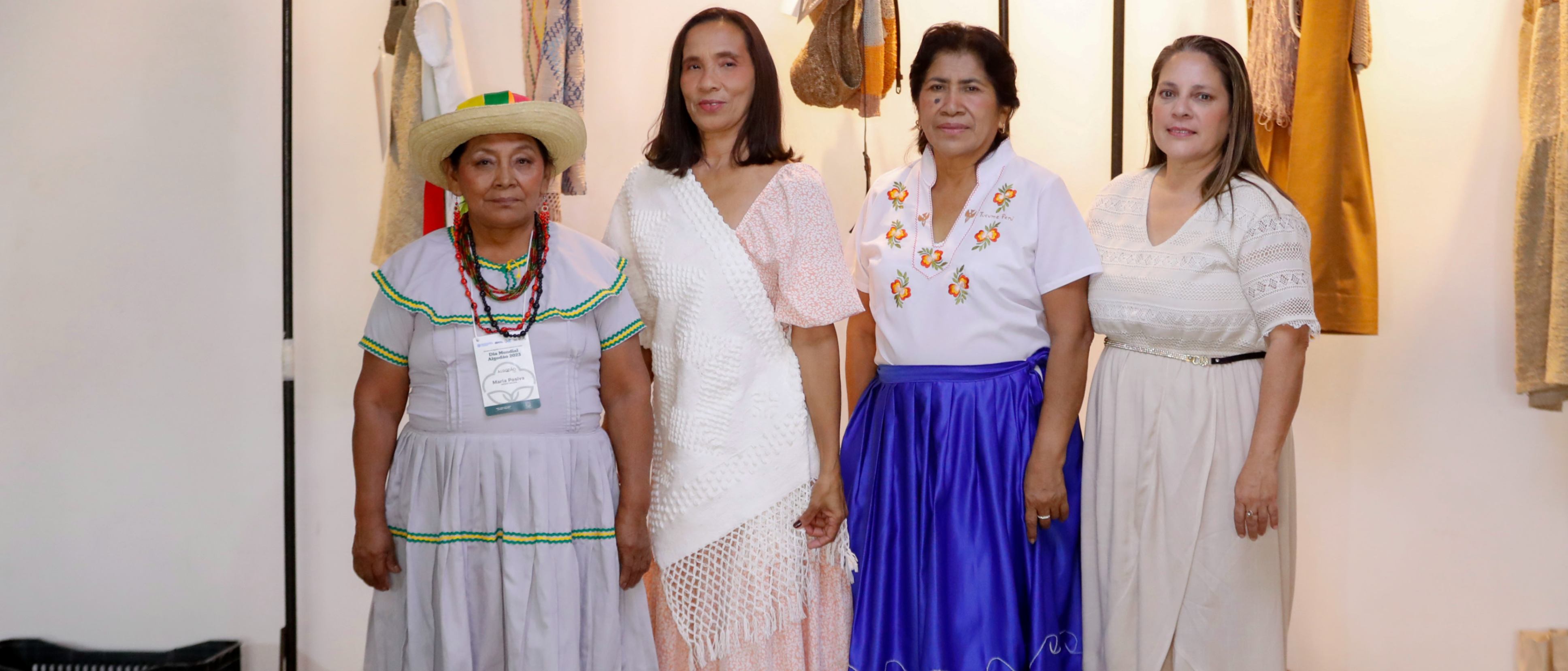 Artisans María Posiva and Carolina Giménez with artisans from Peru and Brazil who also participated in the collection's fashion show in Brazil.