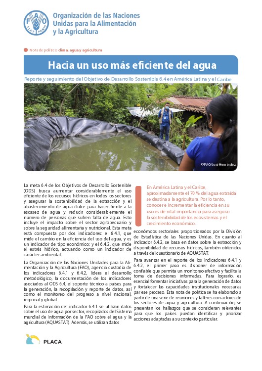 En esta nota de orientación se aborda la Meta 6.4 de los Objetivos de Desarrollo Sostenible, que busca promover el uso eficiente de los recursos hídricos, garantizando la sostenibilidad de la extracción y el abastecimiento de agua dulce.