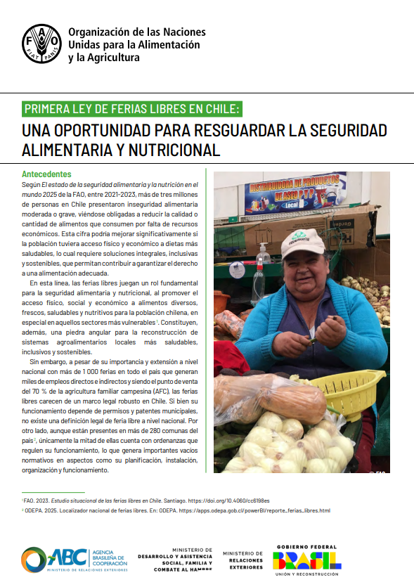 Las ferias libres son esenciales para garantizar el derecho a una alimentación adecuada en Chile. Pese a su importancia para el acceso a alimentos frescos y saludables, no existe una legislación nacional que regule su funcionamiento. Esta publicación presenta el proyecto de ley que busca reconocer, proteger y fortalecer a las ferias libres como pilares de la seguridad alimentaria y el desarrollo local.