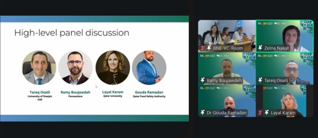 The first high-level panel discussion featured distinguished speakers from partner institutions, Marcello Scalisi, Director for UNIMED and Damiano Petruzzella, Scientific Administrator for CIHEAM. The panelists explored how regional cooperation can drive progress toward harmonized standards, shared databases, and integrated surveillance systems. Following an engaging Q&A session, the event continued with an interactive panel discussion moderated by Zeina Nakat, a Regional Agro-food expert, Trainer and Lead Author. Her session encouraged a deeper reflection on four interconnected pillars of food safety: research, innovation, capacity building, and policy harmonization. Tareq Osaili from the University of Sharjah, Ramy Boujawdeh from Fermendom, Layal Karam from Qatar University, and Gouda Ramadan from Qatar Food Safety Authority shared practical insights on how to bridge scientific knowledge with field implementation. The lively exchange of discussion revealed a shared commitment to turning collaboration into tangible outcomes, with participants stressing the importance of data sharing, sustained training, and harmonized regulatory frameworks.