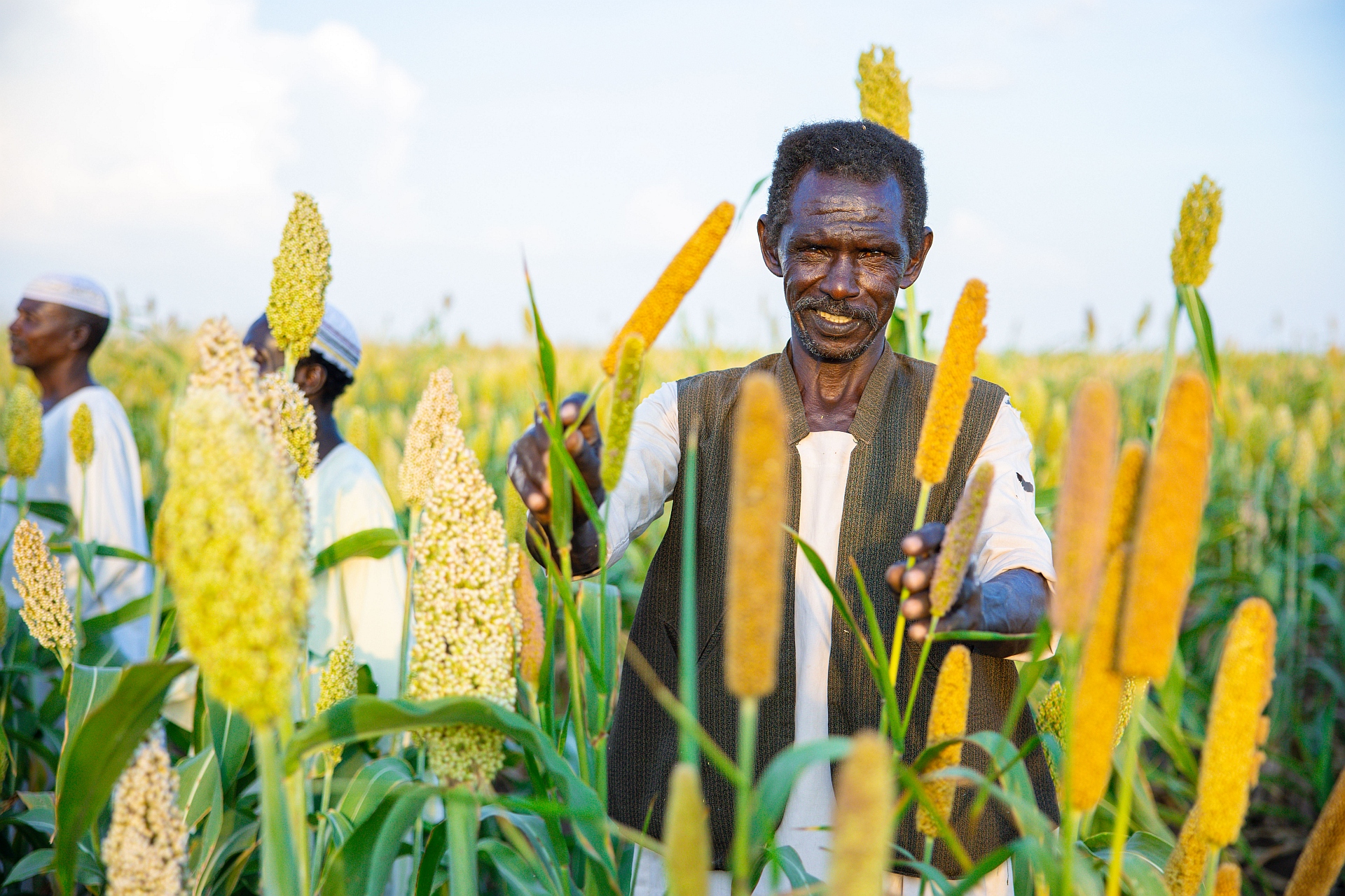 A farmer displays his millet crops, symbolizing resilience and hope after a challenging season in Gedaref, Sudan.