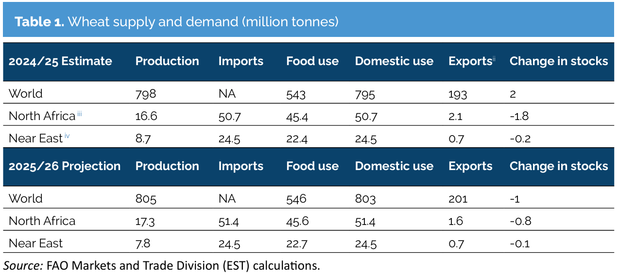 Crop prospects for the 2025/26 season are mixed. Wheat output in North Africa is projected to rise by 4.2 percent, driven by improved rainfall in Tunisia and Egypt’s stable irrigated production, while the Near East subregion faces a 10.4 percent decline, largely due to drought and conflict in the Syrian Arab Republic and Lebanon.