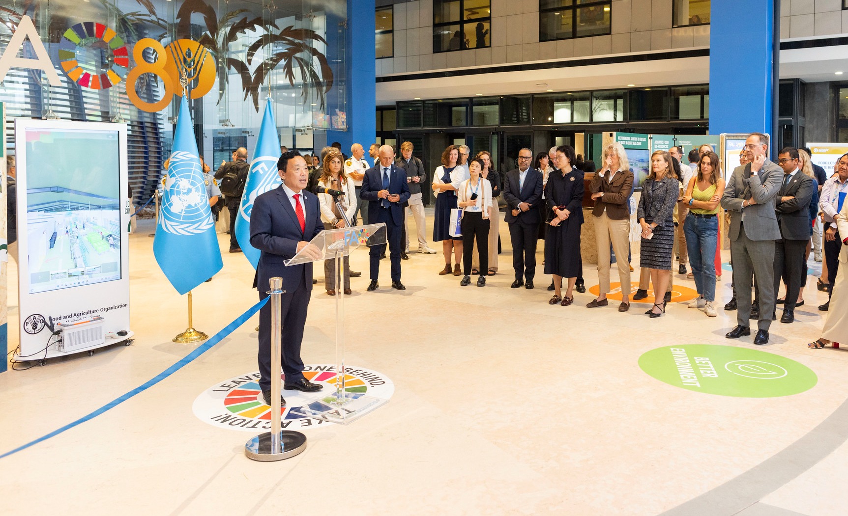 FAO Director-General QU Dongyu delivers an address at the opening of the International Day of Awareness of Food Loss and Waste Exhibition at FAO Headquarters.